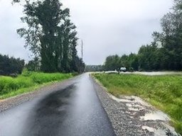 A rainy walk alongside a busy road. Cars occasionally move past.