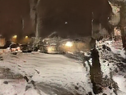Walking outside at night during snowfall. The iPhone's signature green lens flare reflects from a streetlight.